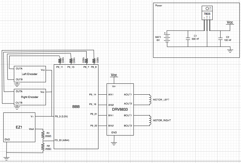 A differential drive robot’s two wheels are placed horizontally adjacent to each other, as if connected by an axle (their “axis”), and their speed is independently controllable. On most (all?) differential drive robots the axis running through the two wheels also runs through the centre of the bot so that any rotation occurs through its centroid in the x-y plane.